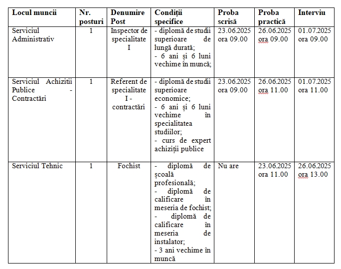 Pentru ocuparea postului de INSPECTOR de SPECIALITATE in cadrul Serviciului Administrativ
