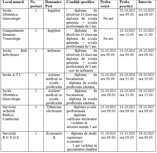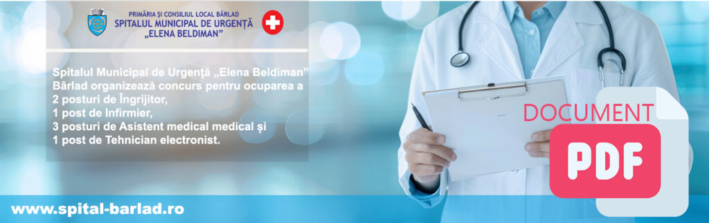 Spitalul Municipal de Urgenţă „Elena Beldiman” Bârlad organizează concurs pentru ocuparea a 2 posturi de Îngrijitor, 1 post de Infirmier, 3 posturi de Asistent medical medical,1 post de Tehnician electronist și un post de Economist II astfel: