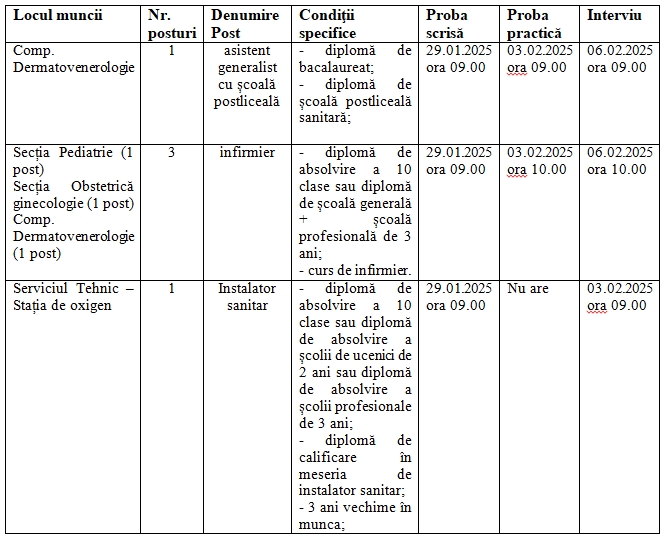 Spitalul Municipal de Urgenţă „Elena Beldiman” Bârlad cu sediul in Str. Republicii nr. 300, Bârlad, jud. Vaslui, cod fiscal: 4446481, Tel. 0235/416.440, Fax. 0235/413.303, Email: spitalul.municipal.barlad@gmail.com, în conformitate cu dispoziţiile HG nr. 1336/2022, organizează concurs pentru ocuparea următoarelor posturi contractuale pe perioadă nedeterminată: