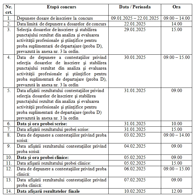 Se pot prezenta la etapa / proba următoare numai candidaţii declaraţi admişi la etapa/proba precedentă. Sunt declaraţi admişi candidaţii care au obţinut minim 50 de puncte la proba scrisă, respectiv 50 de puncte la proba clinică.